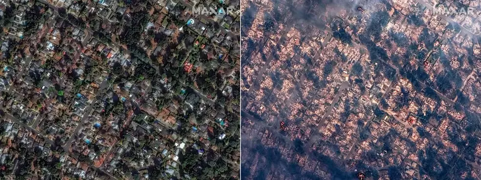 Imagens de satélite capturadas pela Maxar Technologies revelam a extensão devastadora dos incêndios florestais que atingem Los Angeles, na Califórnia. As fotografias, que mostram o "antes e depois" de diversas áreas, expõem a transformação de comunidades inteiras em cenários desoladores, cobertos por nuvens de fumaça cinza e laranja.